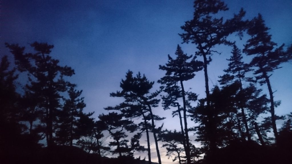 ↑この後、月明かりのあるこの空が木々に覆われると、僕たちは真っ暗な登山道を小一時間ぐらい歩いた。ヘッドライトの光は足元を照らしていたが、一度ライトをつけると僕の目は甘えはじめた。真っ暗ながらも今まではうーっすら自分の足が見えていたのに、ライトの明かりを見た瞬間から僕の目は、もうライト無しでは何も見えなくなってしまった。なるほどね。